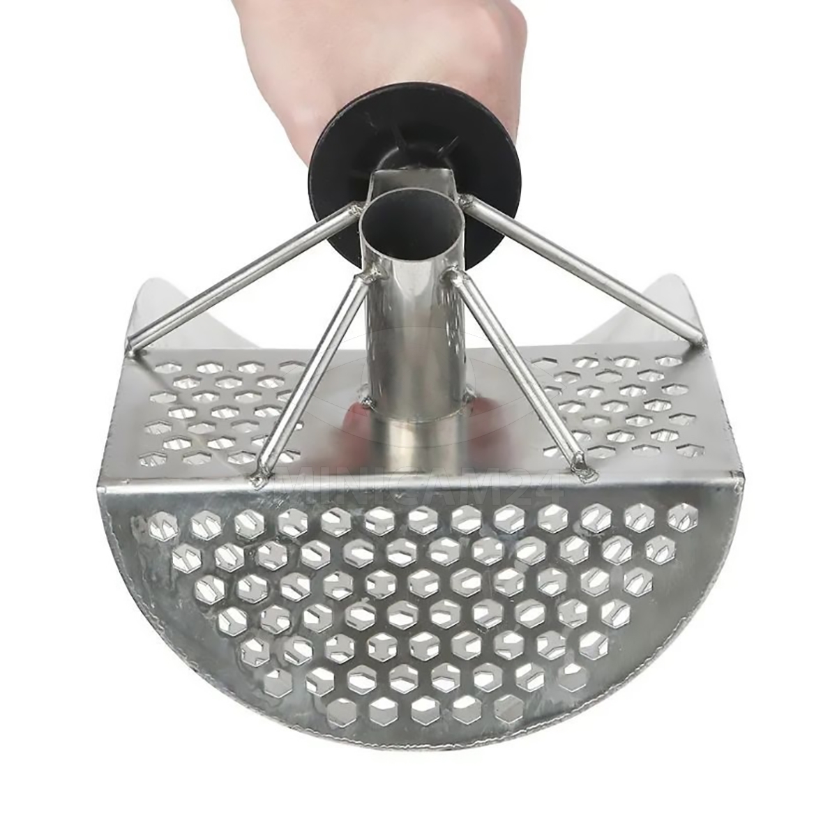 Скуб имеет размеры 295х202х165 мм и весит 903 г. Толщина металла составляет 1 мм. Диаметр отверстий в скубе составляет 85 мм, что позволяет эффективно просеивать песок и грунт, оставляя только ценные находки.